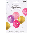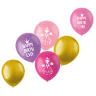 Im Set enthalten sind insgesamt 6 Pretty Princess Latexballons mit dem Maß 33cm. Zwei goldene Ballons ohne Aufdruck, ein fuchsiafarbener und ein hellrosa Ballon mit einer Prinzessin darauf sowie ein lavendelfarbener und ein rosafarbener Ballon mit dem Text ?HAPPY BIRTH DAY?.