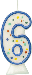 Glitzer Zahlenkerze in Blau mit bunten Punkten 6