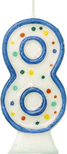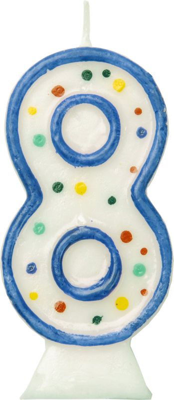 Glitzer Zahlenkerze in Blau mit bunten Punkten 8