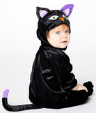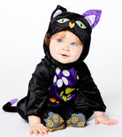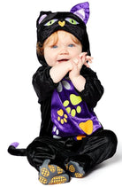 Das entzückende Halloween Katzen Kostüm für Babys besteht aus einem bedruckten Overall mit Kapuze, Füßlingen sowie Katzenschwänzchen. Eine niedliche Kostümierung für Halloween.