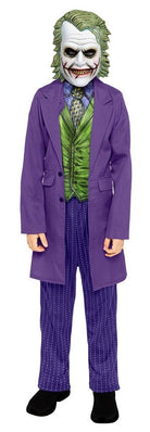 Das 3-teilige Joker Movie Style Kostüm besteht aus einer Hose, einem Mantel und einer passenden Maske. Das Oberteil im Stil einer Weste und eines Hemdes mit Krawatte ist fest in den Mantel eingesetzt. Mit dieser ikonischen Verkleidungen können Kinder an Halloween, zu Fasching oder auf einer DC Mottoparty selbst zum verrückten Joker werden.