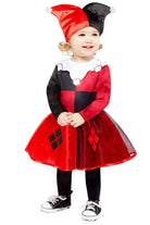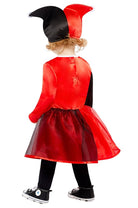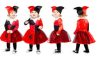 Das Mini Harlekin Kinderkostüm besteht aus einem aufwendig gestalteten roten Kleid mit farblich passendem Hut.