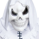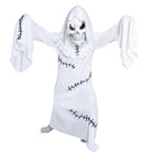 Das Mr Spooky Geisterkostüm für Kinder besteht aus einem weißen Gewand mit diversen aufgedruckten Nähten, überlangen Ärmeln sowie einer Kapuze. An dieser kann die Totenkopfmaske mittels Klettverschlüssen befestigt werden. Ideal für Halloween geeignet.