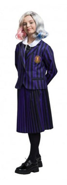 Das leicht taillierte Jackett hat zwei nebeneinanderliegende Knöpfe in der Mitte und ist mit vertikalen Schwarz-Violett-Streifen versehen. Auf der linken Brusttasche prangt das Logo der Nevermore Academy. Der weiße Fake-Hemdeinsatz mit fester Krawatte sowie der knielange, gestreifte Faltenrock runden das Kostüm perfekt ab und machen es zu einer tollen Wahl für Kinder, die Enid oder eine andere Schülerin der Nevermore Academy darstellen möchten.