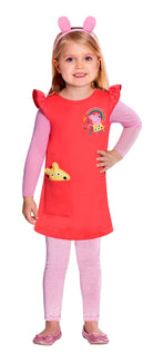 Oink, Oink! Das Peppa Wutz Kostüm für Mädchen verwandelt Ihr Kind in das süße Schweinemädchen Peppa Wutz. Das rote Kleid ist dem von Peppa in der Serie nachempfunden und hat sogar einen Aufdruck von Peppa Wutz auf der Brust. Ein tolles Kostüm für alle kleinen Fans der Serie! Die pinke Leggins und der Haarreif runden das Kostüm ab.