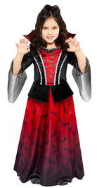 Mit dem Vampir Lady Kinder Kostüm bist du perfekt gerüstet für eine schaurig schöne Halloween- oder Faschings-Party und du wirst sofort im Rampenlicht stehen. Es besteht aus einem langen Kleid in Samt-Optik, es hat ausgestellte Spitzenärmel und einen Stehkragen. Der rot verlaufende Rock und das rote Brustteil verfügen über üppigen Fledermaus Motive, die dem Kleid einen schaurigen Look verleihen.