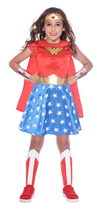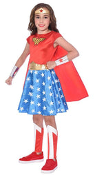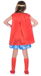 Mit dem Wonder Woman Lizenz Kostüm für Mädchen wird deine Kleine zur waschechten Superheldin! Das Kostüm besteht aus einem Kleid mit aufgenähtem Gürtel und abnehmbaren Umhang, Bein- und Armstulpen sowie dem imposanten goldenen Stirnband. Perfekt für Karnevals- oder Mottopartys!