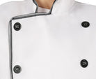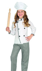 Das Chef Koch Kinderkostüm besteht aus einer weißen Jacke mit großen Knöpfen, einer karierten Hose sowie einer farblich passenden Kochmütze.