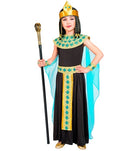 Herrschen in Schönheit! Das erhabene Pharaonin Mädchenkostüm besteht aus einem zauberhaften Kleid mit Gürtel, zwei Armbändern, einem zarten hellblauen Umhang sowie einem königlichen Stirnband.