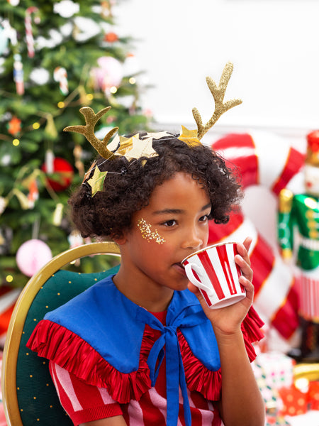 Der goldene Rentier-Haarreif funkelt fröhlich und bringt sofort Weihnachtsstimmung ins Gesicht jedes Kindes. Die kleinen Rentierhörner glänzen in warmem Gold und wirken verspielt, ohne zu schwer zu sein. Weiche, komfortable Bügel sorgen dafür, dass der Haarreif auch über längere Zeit angenehm sitzt. Ein funkelndes Accessoire, das jedes Winteroutfit in ein festliches Highlight verwandelt – perfekt für Weihnachtsfeiern, Fotos oder einfach zum fröhlichen Herumtollen.