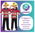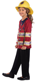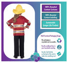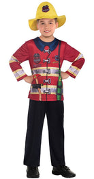 Das Kostüm ist aus recycelten Materialien hergestellt und besteht aus einem roten T-Shirt mit detailliertem Aufdruck und gelber Feuerwehrmütze.