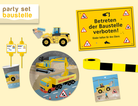 großes Baustellen Partyset für 8 Kinder, Inhalt : 8 Einladungskarten in Baggerform, 8 Becher, 8 Teller, 8 Papierhalme mit Namensschild, 8 Platzsets, 20 Servietten, 10 m orginal Abspprerrband Baustelle
