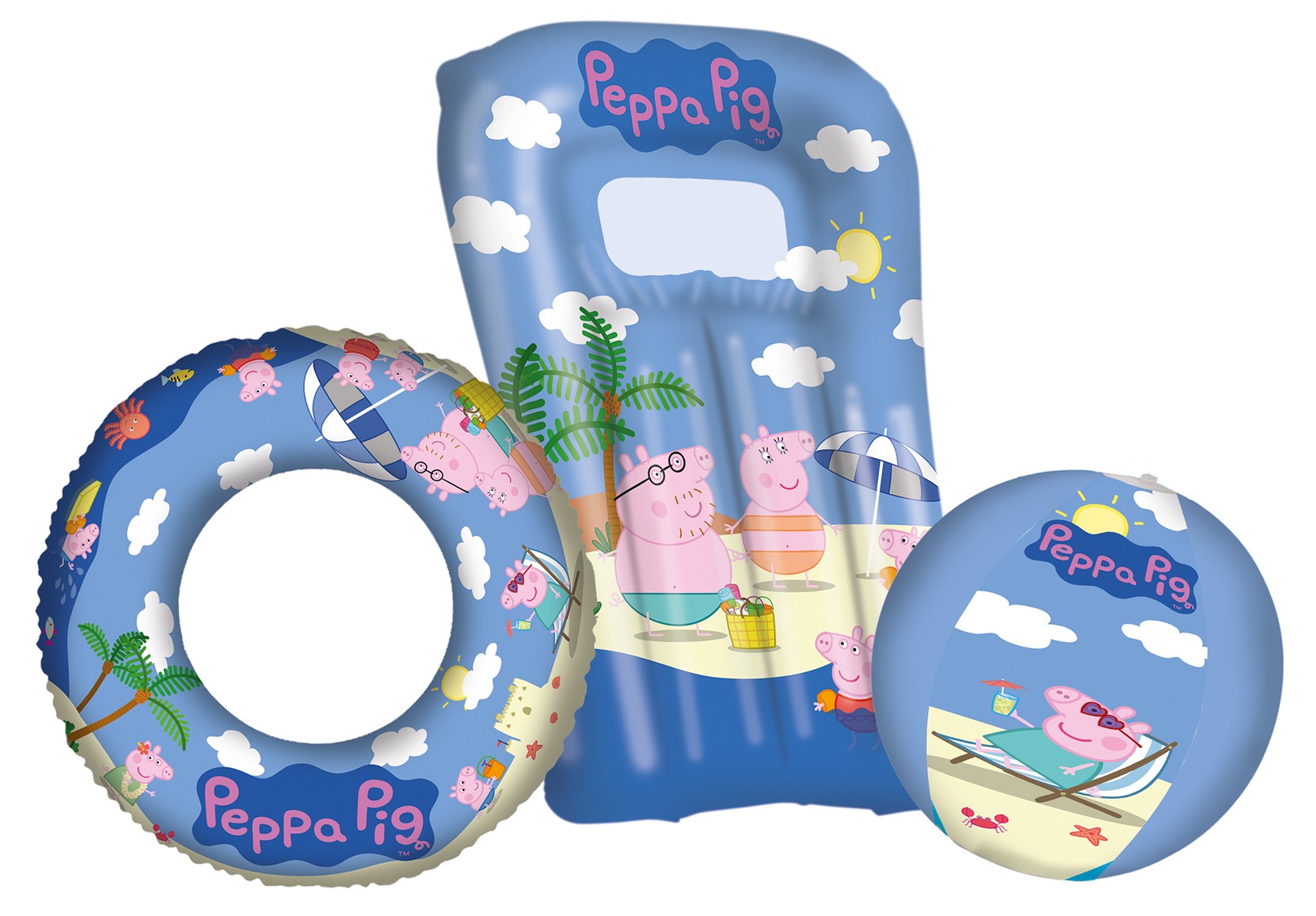 Hol dir dein Strand Erlebnis mit Peppa Wutz nachhause! Das Peppa Wutz Strandtag Set sorgt für den perfekten Tag im Schwimmbad oder am Strand. Im Set enthalten sind ein Schwimmreifen, ein Strandball und eine Kindermatratze - alles um beim Schwimmen ordentlich Spass zu haben.