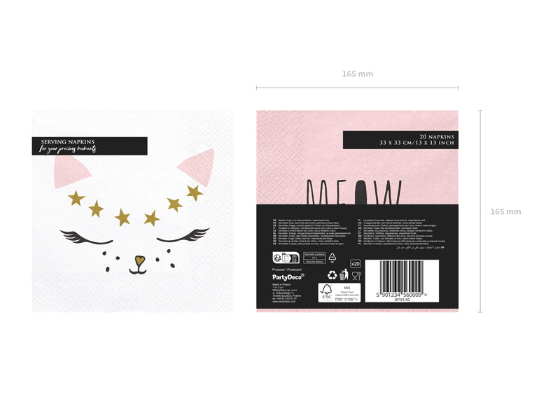 Die 20 Katze Kiki Servietten sind die ideale Abrundung für eine schöne Katzen-Tischdeko. Sie haben aufgeklappt eine Größe von 33 x 33cm und zeigen ein niedliches Katzengesicht als Motiv sowie die Aufschrift MEOW. Sie lassen sich wunderbar mit weiteren Artikeln der Deko-Serie kombinieren.
