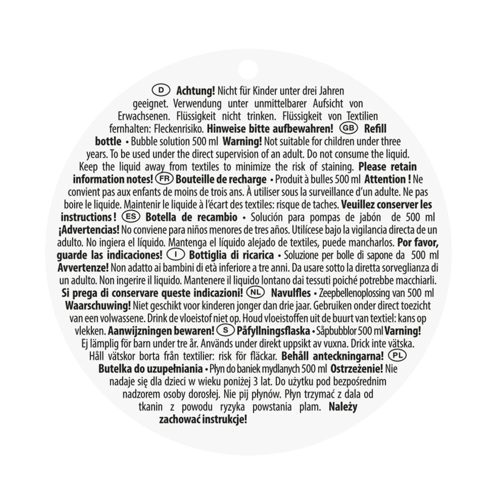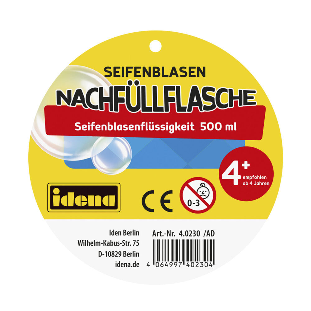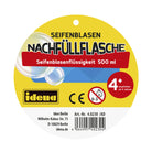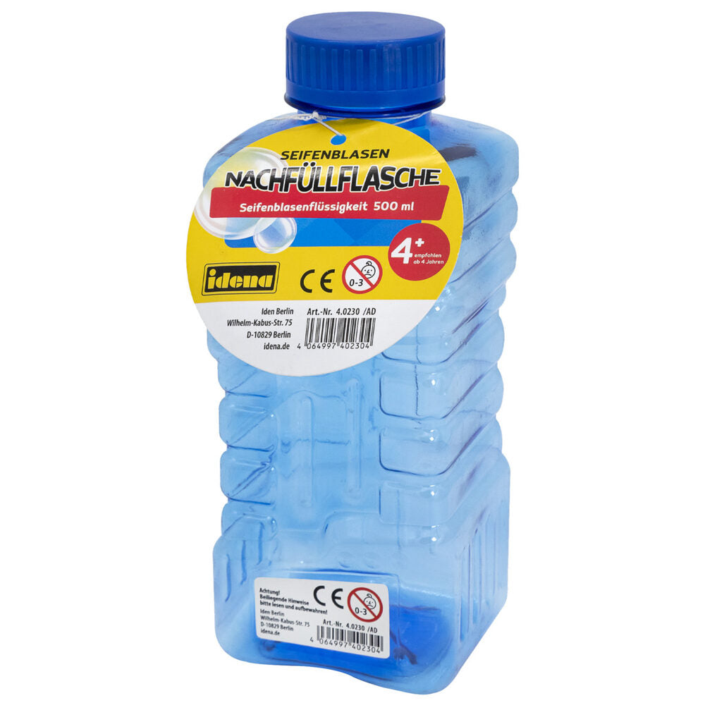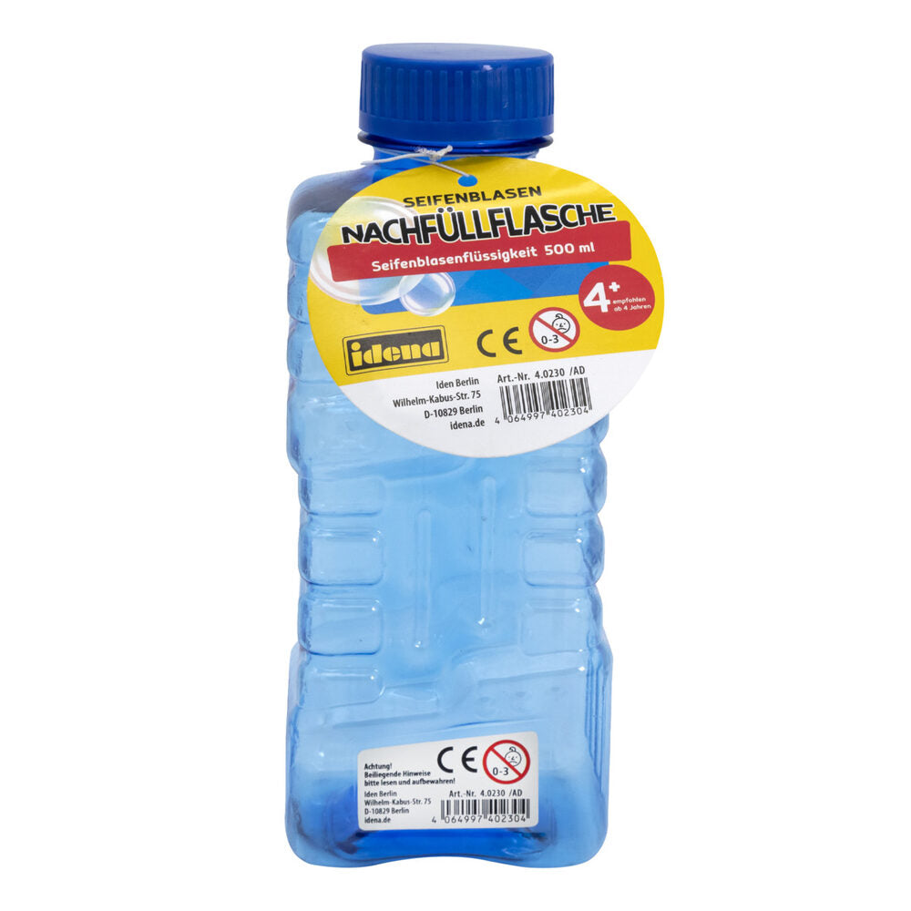 Die Nachfüllflasche für Seifenblasen von Idena enthält 500ml hochwertige Seifenlösung, um Seifenblasenpistolen oder andere Seifenblasenspielzeuge wieder aufzufüllen. Diese Lösung sorgt für stabile und langanhaltende Seifenblasen und bietet stundenlangen Blubberblasenspaß.