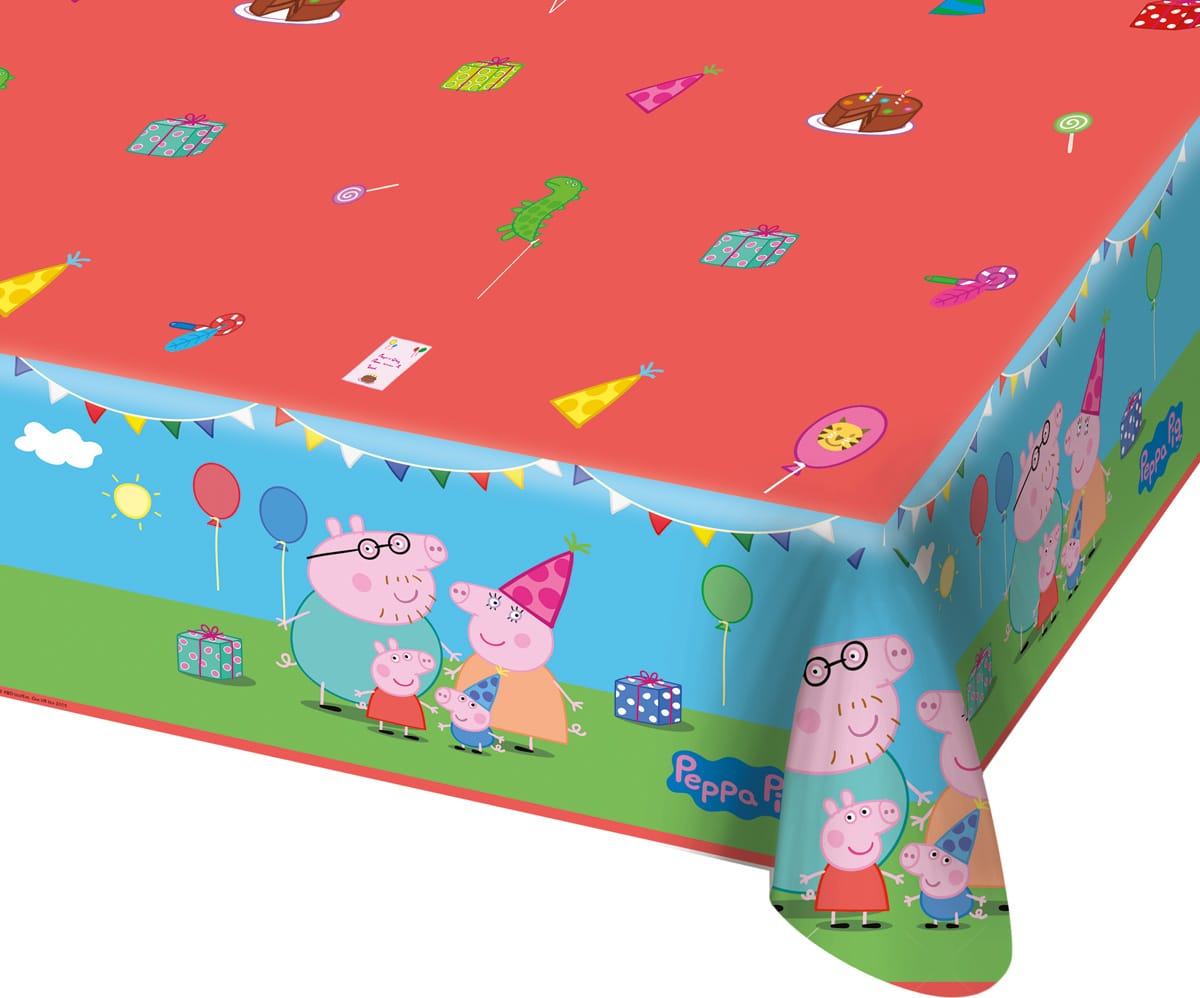 Die lustige Peppa Wutz Tischdecke bringt Spaß und Abenteuer zu dir nach Hause. Die Tischdecke besitzt eine Größe von 1,8 x 1,3m und schmückt jeden Geburtstagstisch. Die wasserabweisende Kunststofffolie sorgt dafür, dass der Tisch frei von Speise- und Getränkeflecken bleibt. Also nichts wie ran an das leckere Geburtstagsbuffet.