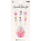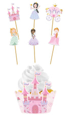 Im Lieferumfang sind insgesamt 6 Pretty Princess Cupcake Topper mit 10cm Länge sowie 6 Banderolen enthalten. Die Motive zeigen Prinzessinnen, einer Kutsche und ein Schloss sowie 6 ca. 22,5 cm lange und 5 cm hohe rosafarbene Wrapper mit einem Märchenschloss oben drauf.