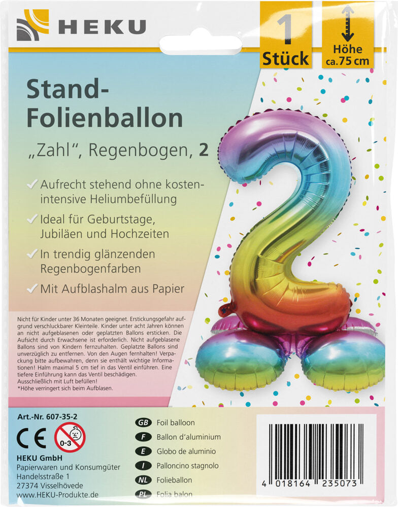 Stand Folienballon Regenbogen Zahl 2 75cm
