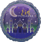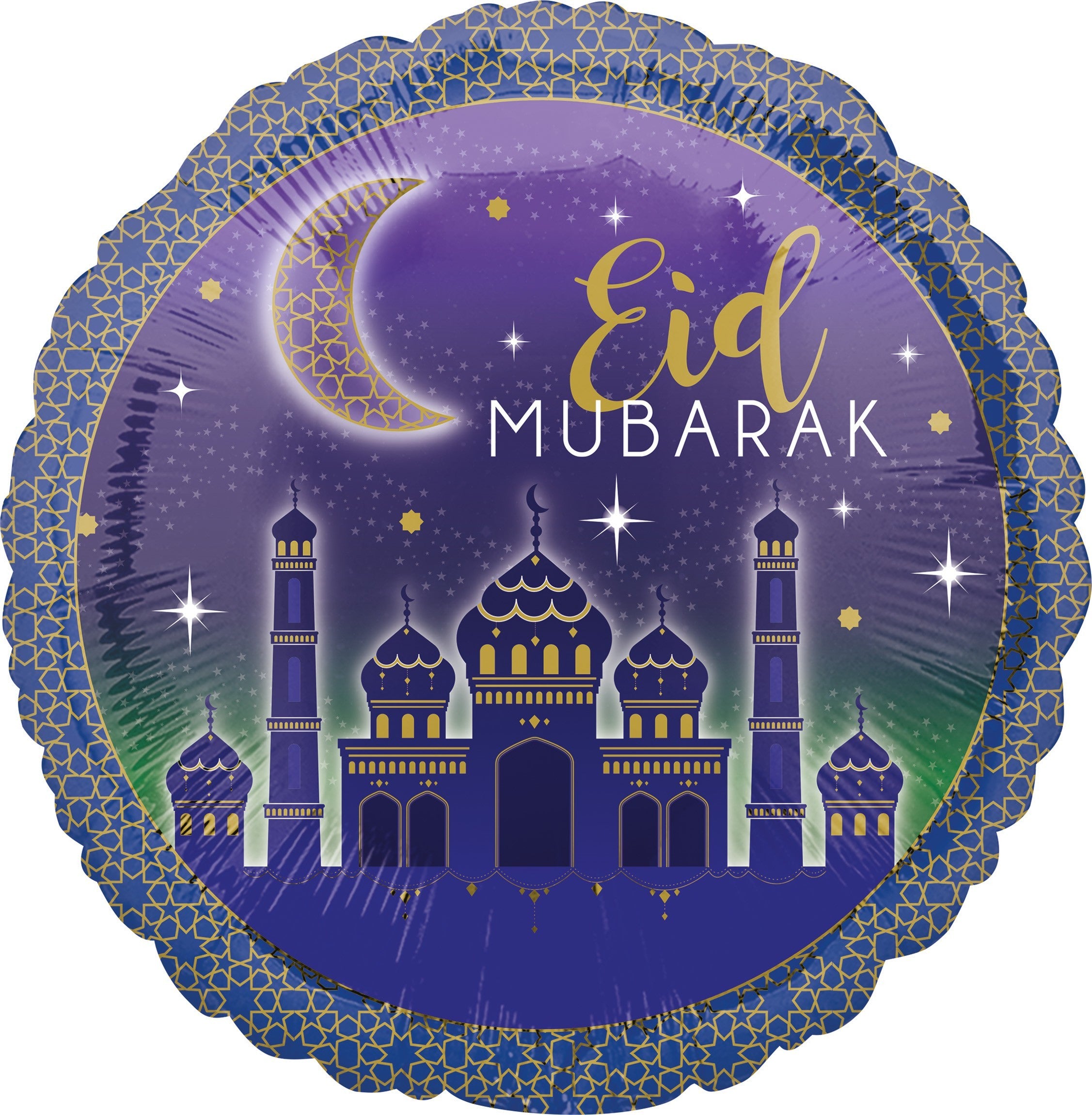 Ein gesegnetes Fest wünscht du mit diesem zauberhaften Folienballon Eid Mubarak! Der runde Ballon hat einen Durchmesser von etwa 43cm und ist somit für die Füllung mit Luft oder Helium geeignet. Neben dem schönen Nachthimmel-Motiv überzeugen auch die Farben in glamourösem Lila, Blau und Gold.