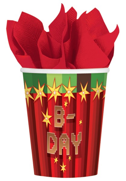 Gaming-Tischdekoration: Verwende Tischdecken, Servietten und Teller in den Farben der gewählten Spiele. Stelle kleine Figuren oder Requisiten aus den Spielen auf den Tischen auf, um die Gaming-Atmosphäre zu verstärken.
