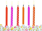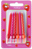 6 Tortenkerzen im bunten Erdbeerdesign mit Halter 6,5cm