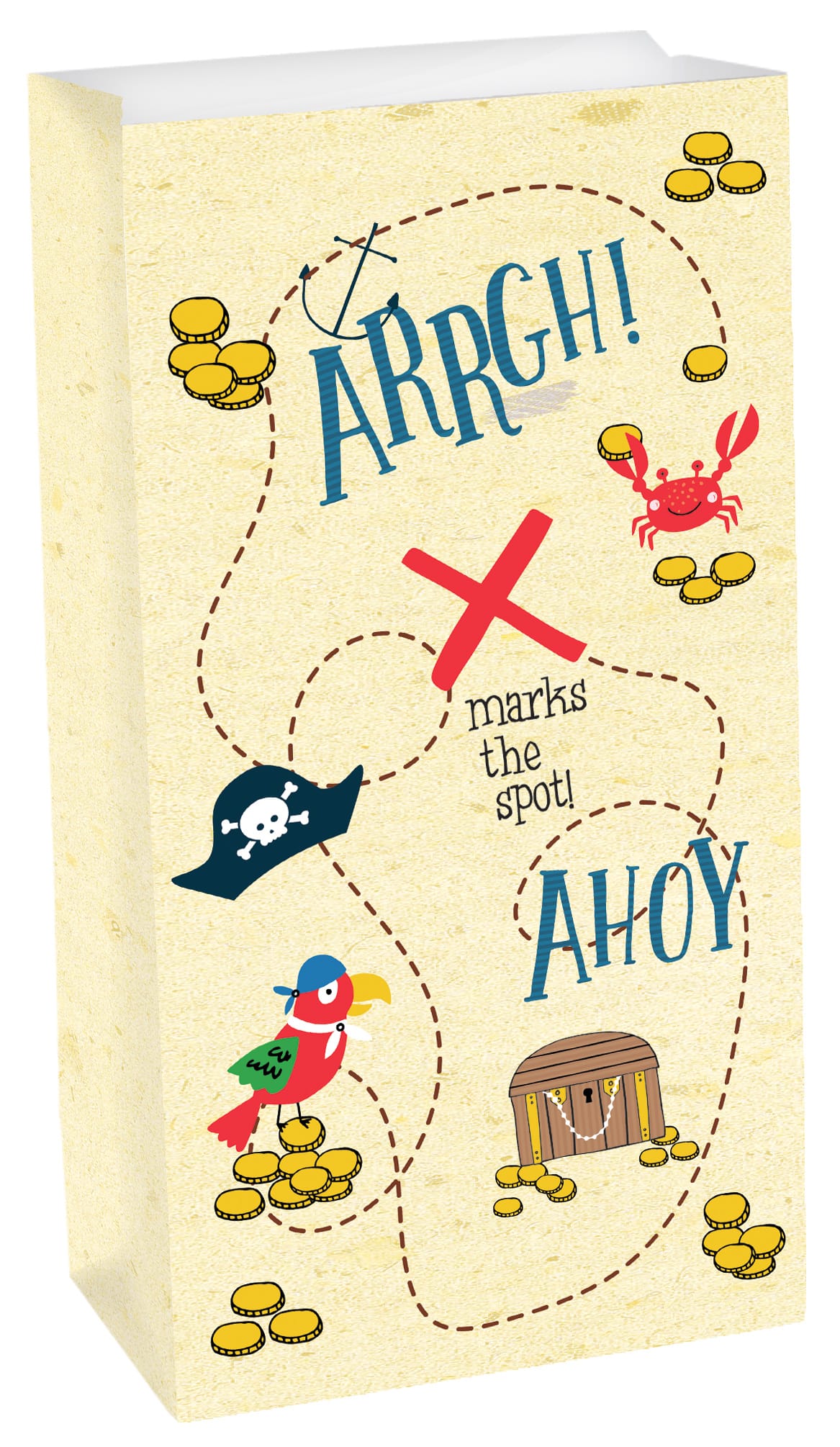 Ahoy Pirat! Die 8 Partytüten Ahoy Birthday Papier sind ideal für Mitgebsel oder kleine Knabbereien auf deiner nächsten Piratenparty. Die Tüten sind in toller Schatzkarten-Optik mit großem roten Kreuz, Dukaten und Papagei gehalten und haben ein authentischen ausgewaschenes Design. Maße: 12,7 x 24,1 x 7,6 cm