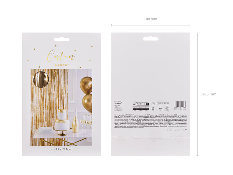 Wenn deine Gäste durch diesen goldenen Lametta-Vorhang zu deiner Party gehen, kann diese ja nur spektakulär glamourös werden. Dieser Vorhang kann sowohl an Fenster als auch an Türen angebracht werden und wertet deine Party toll auf. Besonders schön wirkt der 2,5m x 90cm große Vorhang auch als Foto-Hintergrund. Einfach mit Klebestreifen anbringen oder eine Schnur durch die Ösen am oberen Rand fädeln und aufhängen. Je nach Belieben kannst du die Länge der 0,5cm breiten Streifen ganz einfach mit einer Schere kürzen. Dieser metallische Hingucker eignet sich besonders für festliche Anlässe wie Weihnachten und Silvester, aber auch für glamouröse Feiern wie Hollywood oder 20er Jahre Mottopartys.