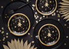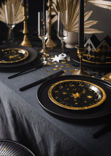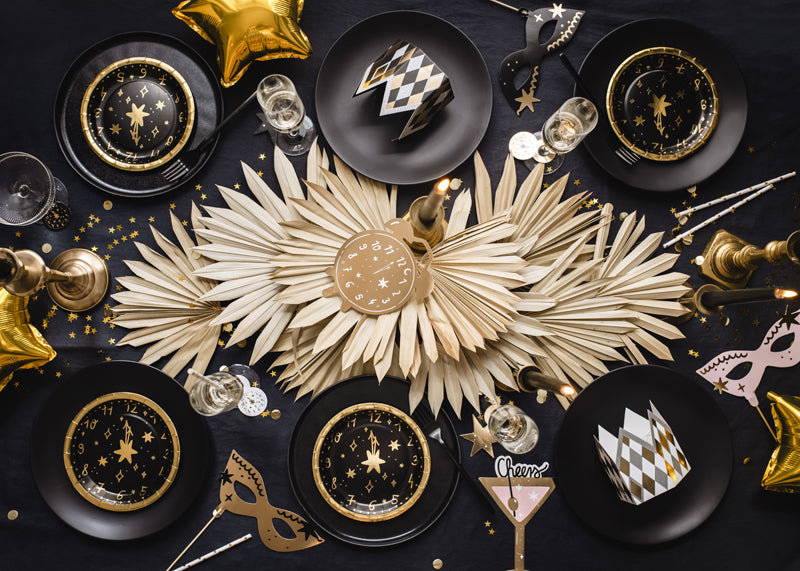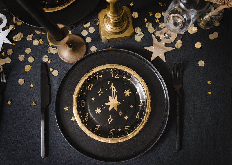 Feiere stilvoll in das neue Jahr mit den Mitternachtszauber Papptellern! Das elegante Design in Schwarz mit goldener Uhr und Sternendetails macht sie zum Highlight jeder Silvesterparty. Die goldenen Zeiger stehen kurz vor Mitternacht, somit ideal für den großen Countdown!