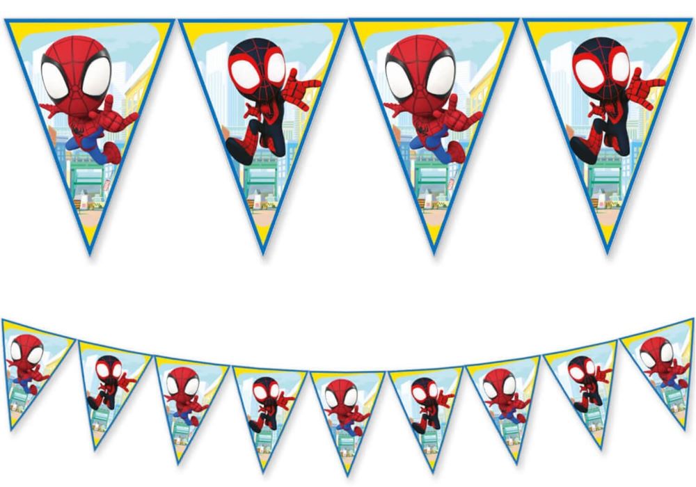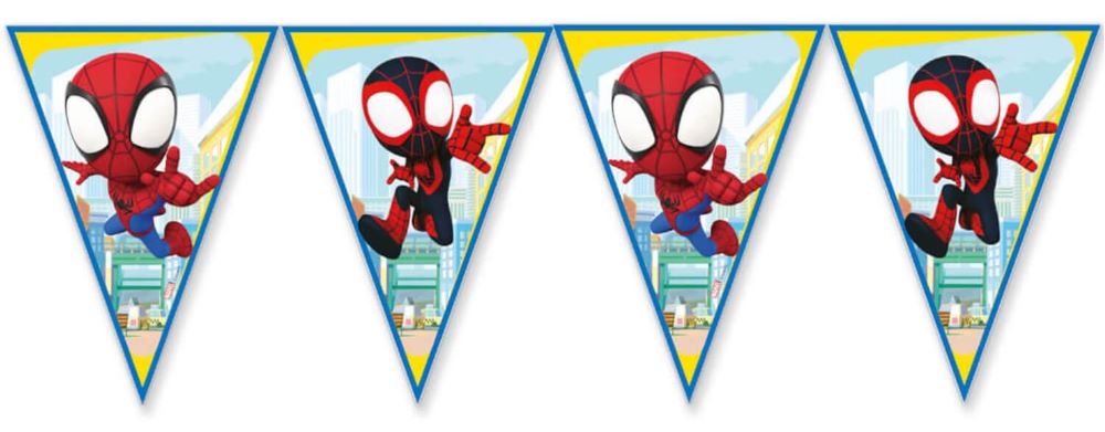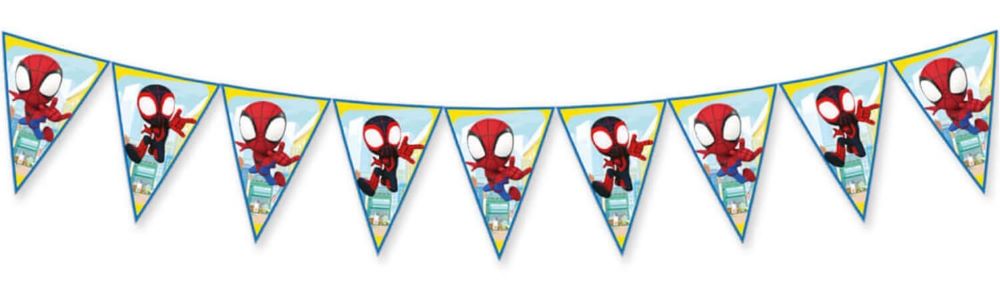 Eine richtig tolle und eindrucksvolle Raumdekoration schaffst du dir mit der Spidey and Friends Wimpelkette. Im Lieferumfang enthalten ist eine Wimpelkette mit einer Länge von 2,3m. Die einzelnen Papierwimpel sind mit Bildern des kleinen Superhelden bedruckt und circa 25cm x 18cm groß.
