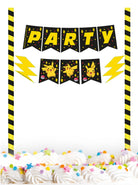 Diese Tortendekoration PoKéMoN zeigt einen Aufdruck der Pokemon-Figur Pikachu, umgeben von den bekannten roten und weißen Pokebällen und gelben Blitzen. Dieses Pokemon-Tortendekorationsset hat eine Größe von etwa 19x25cm und besteht aus gelbem und schwarzem Kartonpapier mit kleinen ?Party?-Wimpeln sowie Pikachu-Wimpeln oder auch kleinen Eclairs. Eine tolle Dekoration für Fans des Animes, die jede Torte großartig aussehen läßt.