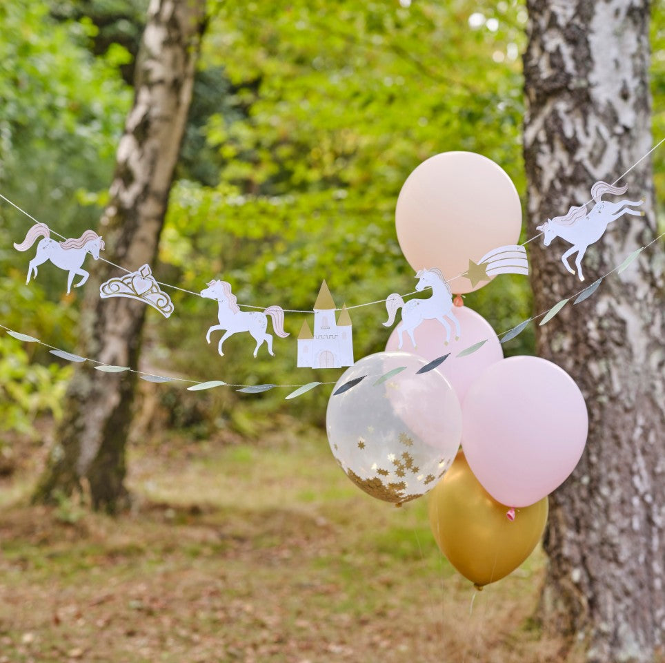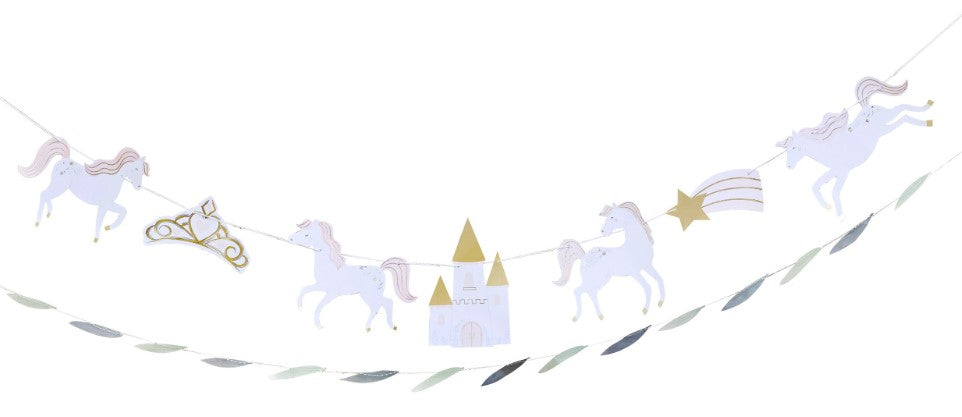 Drapiere diese Princess to be Motiv-Girlande 2m mit Pferden, Krönchen und Märchenschloss um deine Party herum. Mit den bezaubernden Märchenfiguren und der kontrastierenden Blattgirlande ist dieses Ensemble eine unverzichtbare Dekoration für jede Prinzessinnenparty.