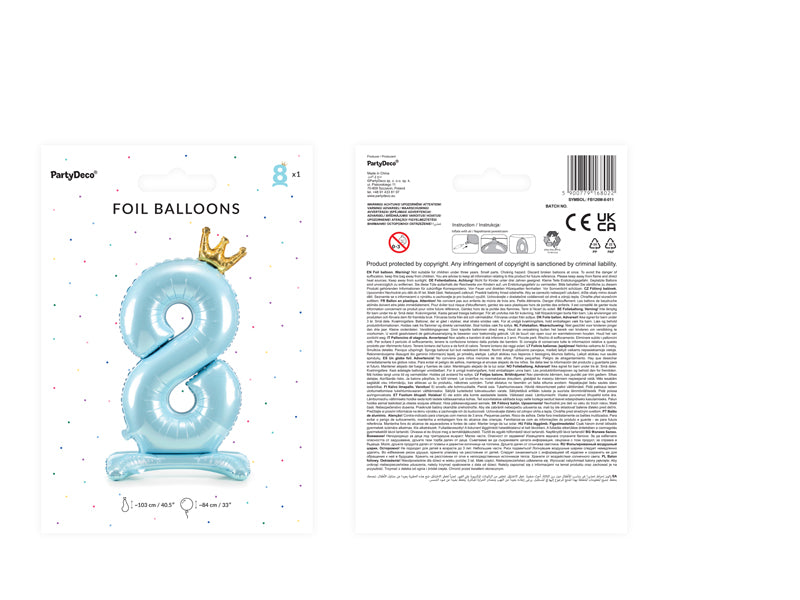 Air-Loonz sind die neuen Riesenballons, die auf jeder Party ein richtiger Hingucker sind. Natürlich auch als Geschenk ein absolutes Highlight. Mittels eines Strohhalmes wird der Babyblue Zahl 8 Folienballon stehend ganz leicht aufgepustet und nur mit Luft gefüllt. Eine Befüllung mit Helium ist nicht notwendig. Der himmelblaue Ballon mit der hübschen goldenen Krone ist 84cm hoch.